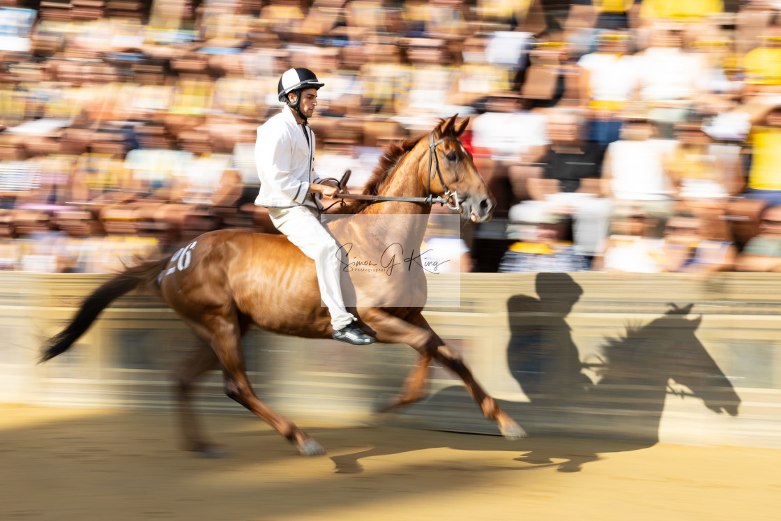 Benitos AA ridden by Alessandro Cersosimo during the Prima batteria, Palio del 16 agosto 2025
