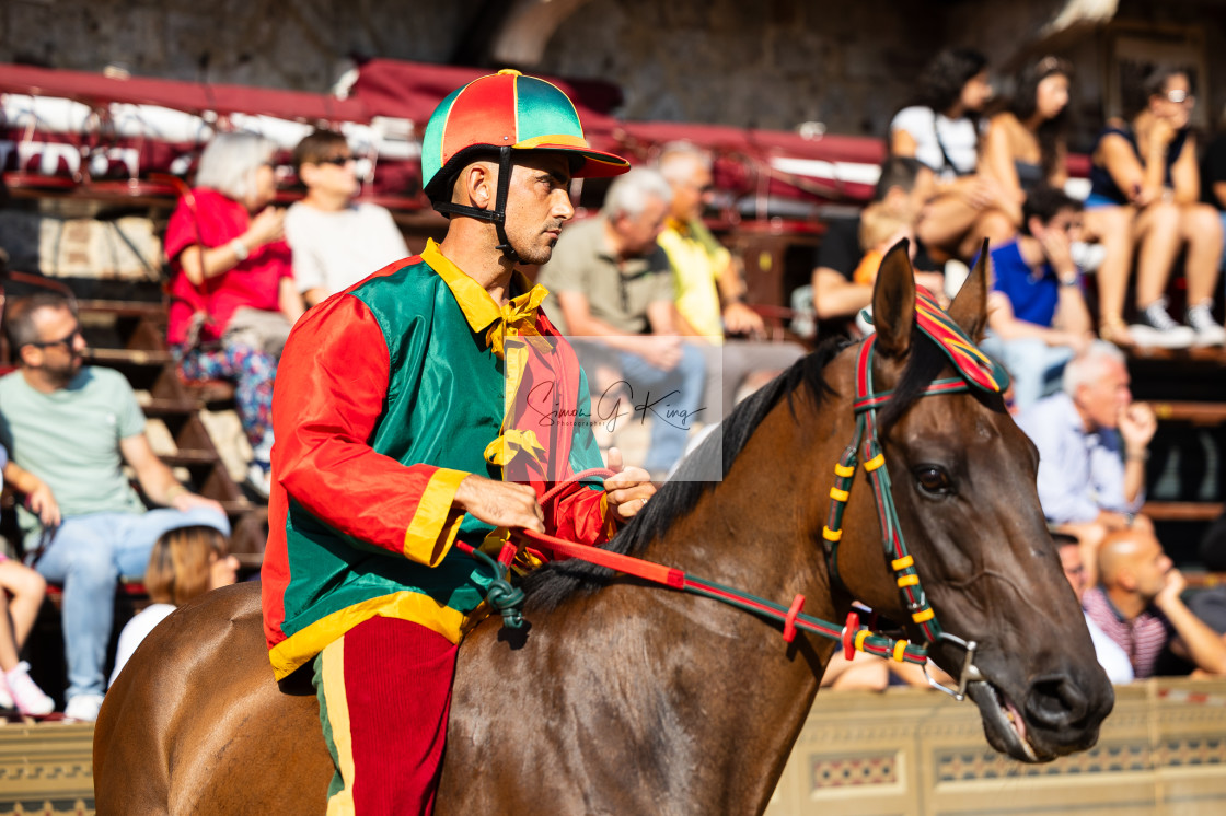 Andrea Coghe detto Tempesta for Drago Contrada rides Zenis waits to be called to the start in the final prova during the Palio di Siena in Siena, Tuscany, Italy on 16 August 2025.