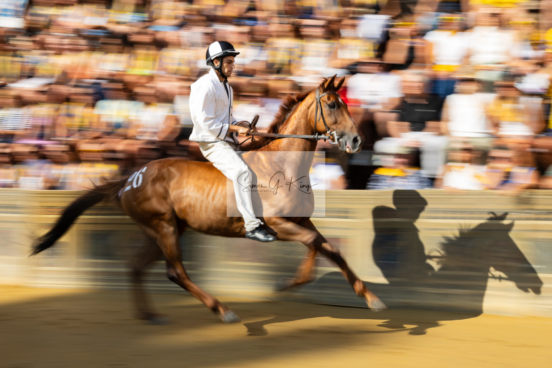 Benitos AA ridden by Alessandro Cersosimo during the Prima batteria, Palio del 16 agosto 2025