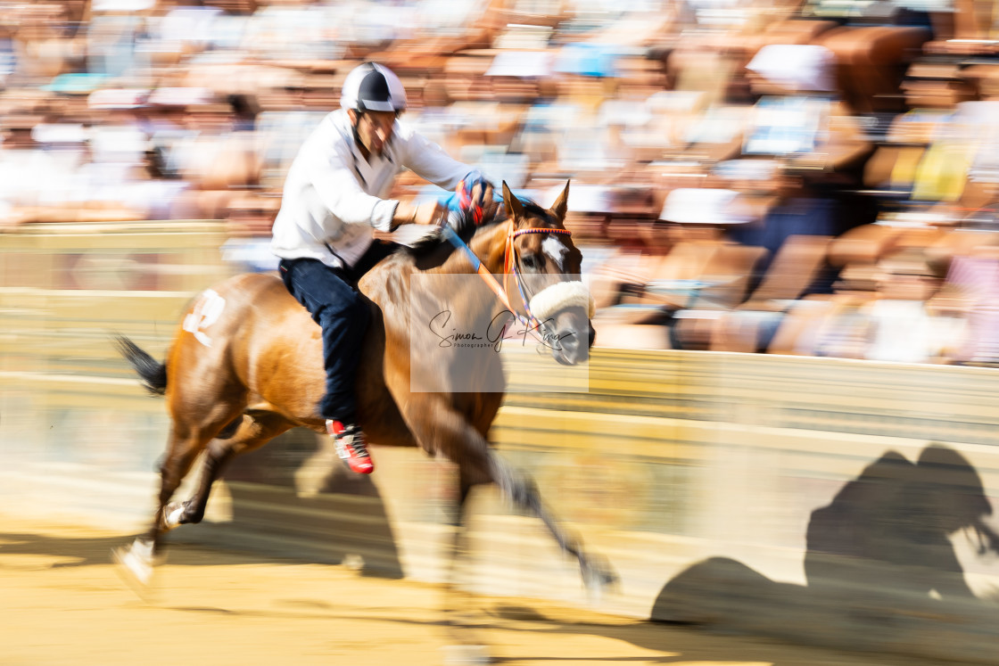 Dollaro AA ridden by Nicolo’ Chiara during the Prima batteria, Palio del 16 agosto 2025