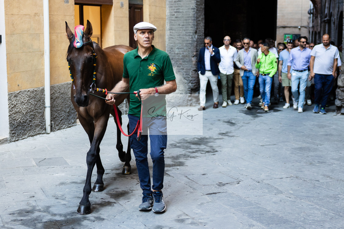 Ricardo Vegni of Drago Contrada leads Zenis to il Campo for Quarta Prova during the Palio di Siena in Siena, Tuscany, Italy on 15 August 2025.