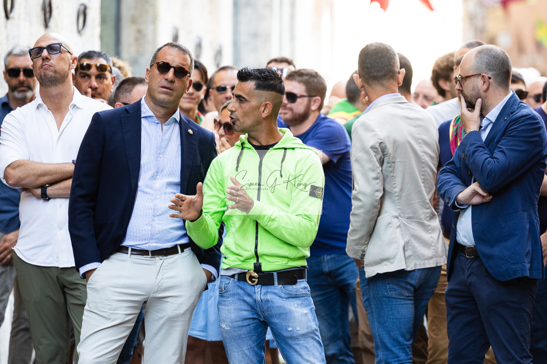 Andrea Coghe detto Tempesta for Drago Contrada talks with Captain Jacobo Gotti of Drago Contrada before the Quarta Prova during the Palio di Siena in Siena, Tuscany, Italy on 15 August 2025.