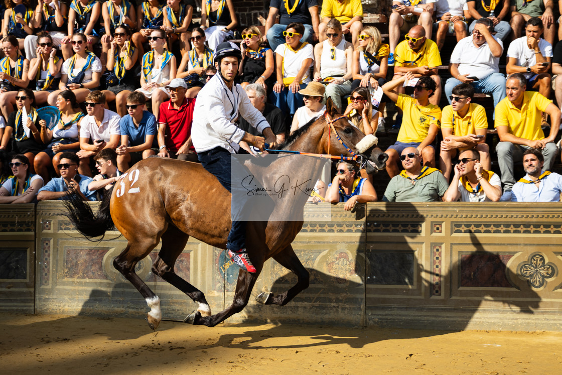 Dollaro AA ridden by Nicolo’ Chiara during the Prima batteria, Palio del 16 agosto 2025